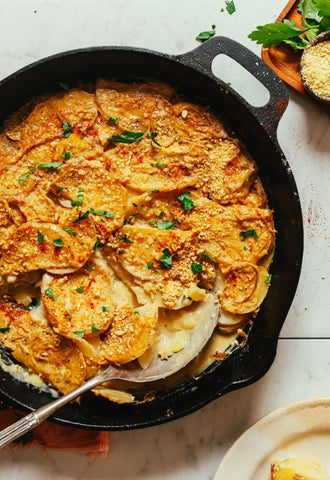 Take your taters to the next level with these vegan scalloped potatoes. Cheesy, creamy and dreamy, this side dish is easier than it looks and sure to warrant an appreciative thumbs up from herbivores and omnivores alike.